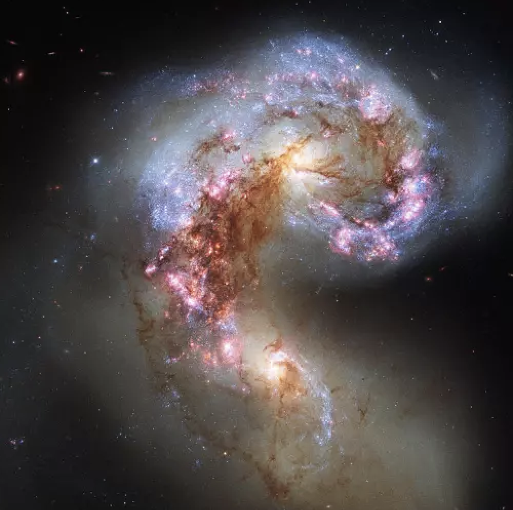 In the image above of the Antennae Galaxies, we see what astronomers may describe as chaos. Clouds of gas are seen in bright pink and red, surrounding the bright flashes of blue star-forming regions – some of which are partially obscured by dark patches of dust.