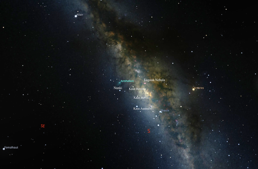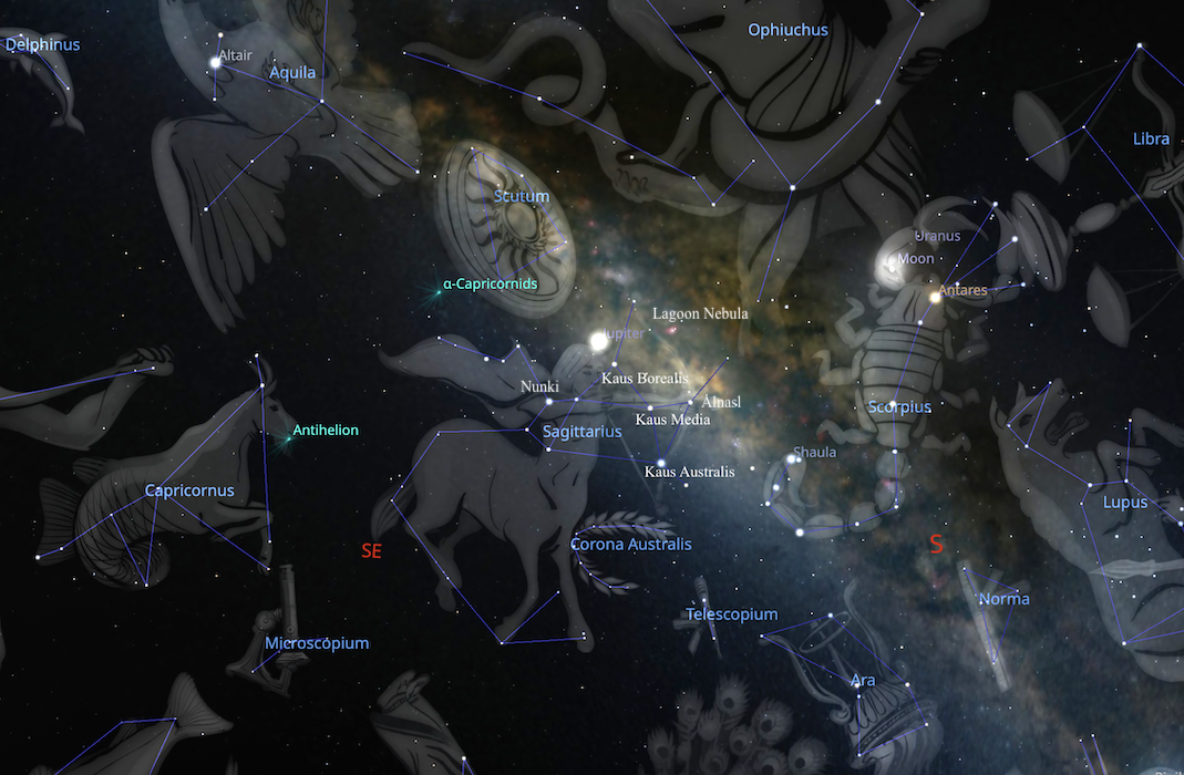 This is an example of what it may look like if you have planets in this part of the sky and had a celestial natal reading with me. In this example I’ve just turned on the constellation art for the purpose of better understanding and seeing which constellations I am speaking of. The teapot asterism, as you can see, is where the Kaus stars of the archer’s bow are.